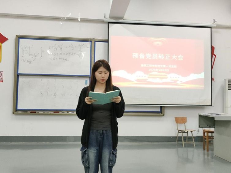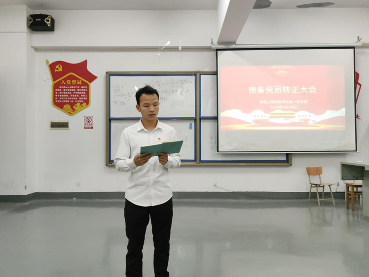 2024年5月28日晚,建筑工程学院学生第一党支部于8B-309教室顺利召开预备党员转正大会,讨论本学期申请转正的预备党员转正等事宜。会议由学生第一党支部书记李鸿永老师主持。