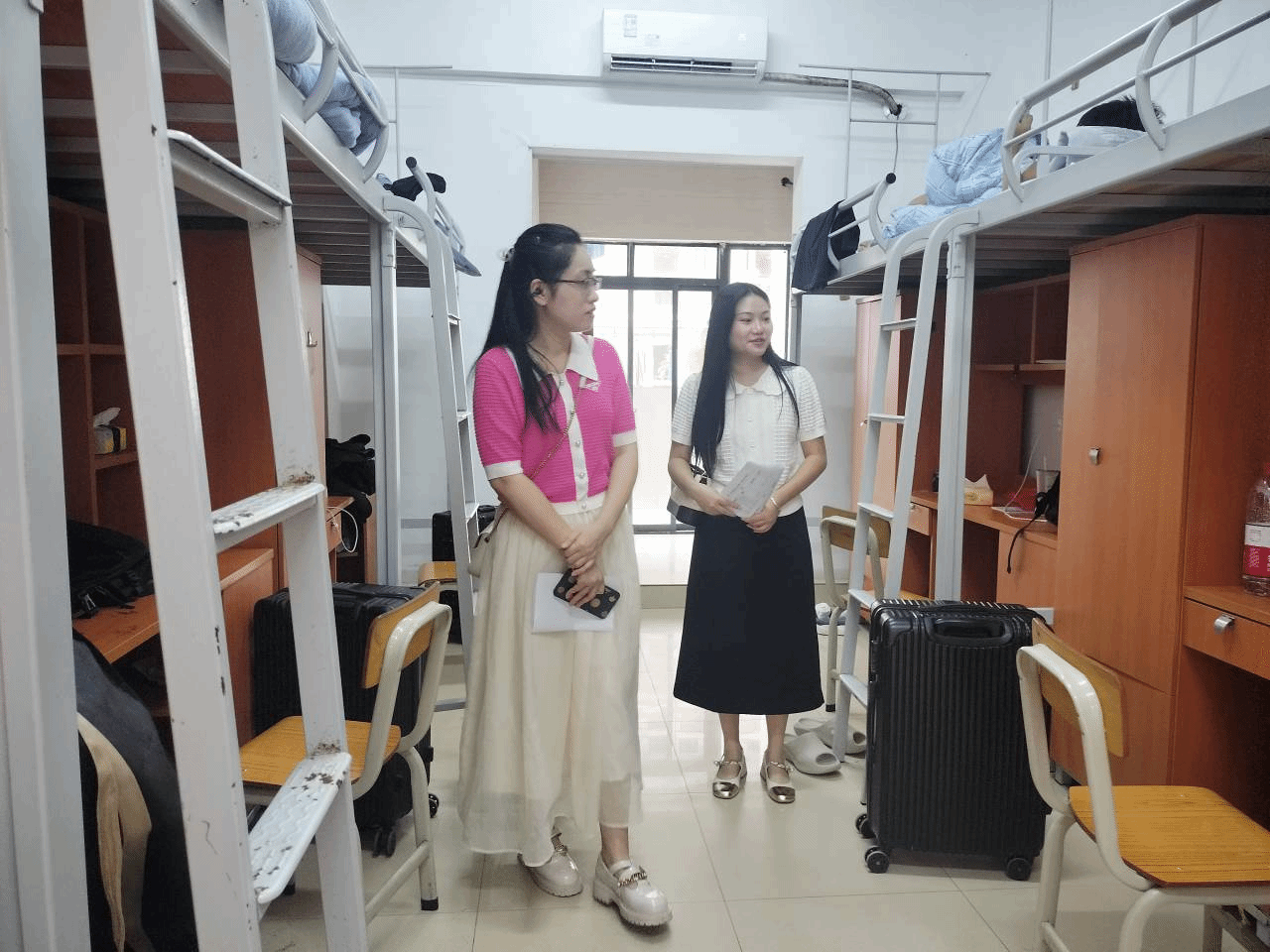 韦静月副书记叮嘱同学们注意个人卫生和健康状况、注意用电安全和财产安全、保持良好的生活习惯。同时希望同学们在校期间认真遵守学校相关规定,有任何困难及时反馈,多与班主任、辅导员沟通交流。希望新生们能够打好基础,养成良好的生活习惯,共同创造出一个文明、和谐的宿舍环境。