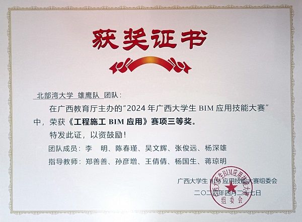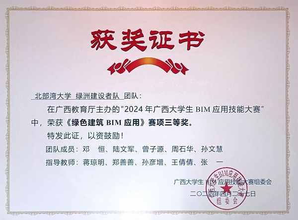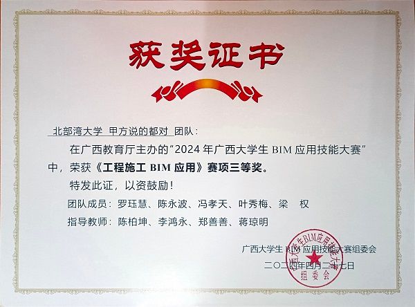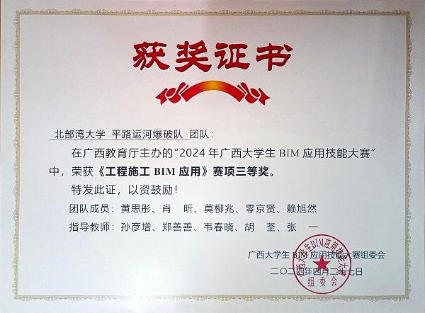 近日,“2024年广西大学生BIM应用技能大赛”比赛结果公布,我院学子李明、邓恒、黄思彤、罗珏慧所带领的团队在大赛中均取得三等奖的佳绩。