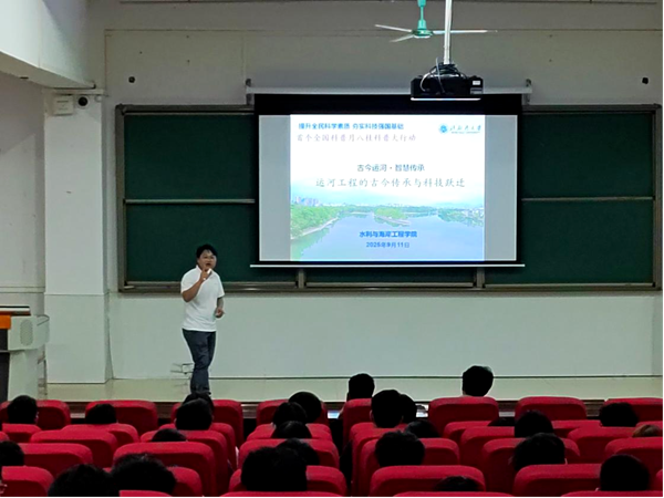 随后,杨再智老师结合灵渠与平陆运河两大国家战略工程,给全体新生开展了“古今运河·智慧传承”科普讲座,系统解析了灵渠的分水铧嘴结构原理、陡门水位调控方法及生态协同设计思想,以及平陆运河建设的全生命周期管理、生态航道构建技术、智慧运河建设等创新理念与技术,提高了同学们对水科学、生态保护与国家战略的认知和认同。图书馆龚俅老师从纸质藏书、电子数据库、特色资源等方面介绍图书馆馆藏优势,演示资源检索与借阅操作方法,助力新生学会运用学术资源提升学习能力。