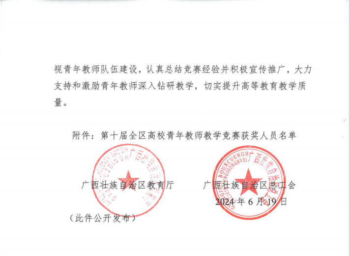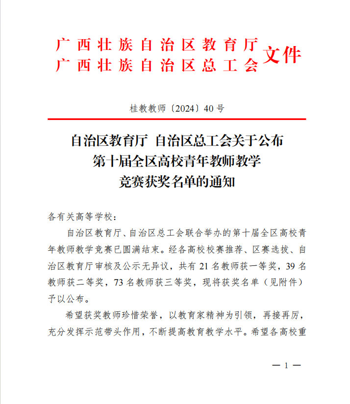 据悉,本届竞赛由自治区教育厅、自治区总工会联合主办,是广西辐射面最广、组织规模最大的高水平教学类竞赛。学院领导对此次比赛高度重视,认真组织老师参加校赛选拔,做好参赛教师的培养和支持,并以此为契机,加大对学院教师教学设计、现场教学、教学反思等方面的培训力度,通过以赛促教、以赛练赛,提升教师教学能力,推进课堂教学改革,提升课堂教学质量。