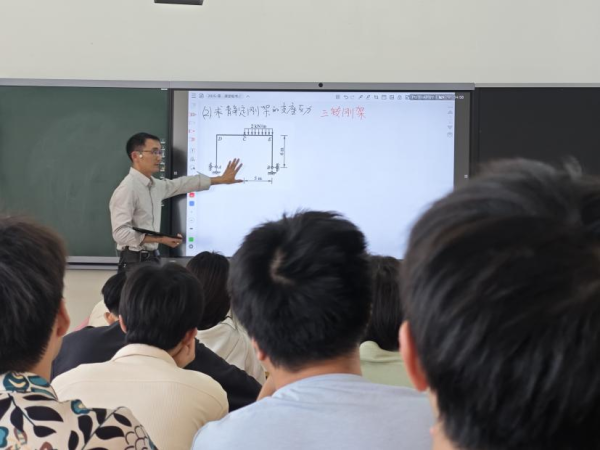 蒋琼明老师在课堂上采用了以学生为中心的教学方法,结合学生课前预习情况和问题总结,精准确定了本次课堂的教学重点和难点。同时,蒋老师根据课程需要书写大量力学计算过程的特点,巧妙地结合平板投影技术进行授课,使复杂的力学计算过程更加直观清晰,学生能够实时观察计算的每一步骤,加深对知识点的理解。课堂上,蒋老师还积极引导同学们思考问题、探索答案,增强课堂互动式体验。