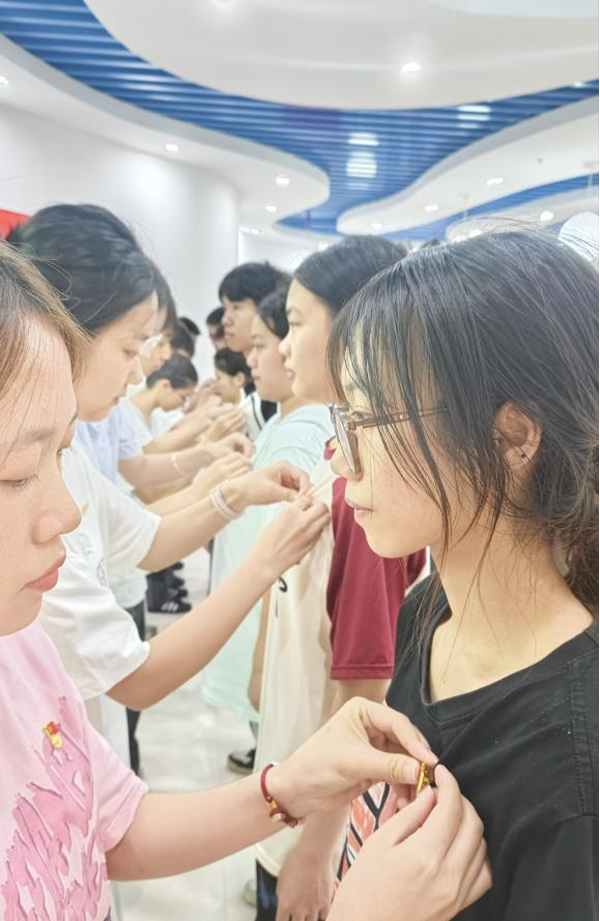 仪式上,张蕾蕾宣读了党委同意接收14名预备党员的决定。老党员代表为新入党党员佩戴党员徽章,传递职责使命。