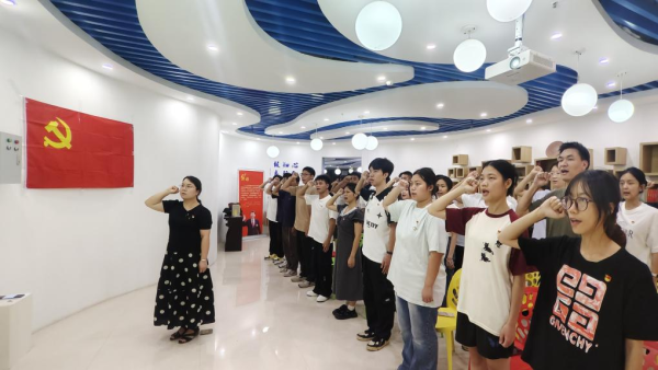 “我志愿加入中国共产党……”,在鲜艳的党旗下,全体新老党员举起右手、紧握右拳,慎重宣读入党誓词。铿锵有力的声音传递着对党的忠诚与信仰的力量,大家以青春之名许下终身承诺。