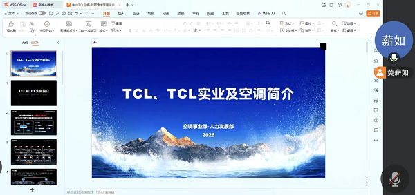 宣讲会上,中山TCL制冷设备有限公司人事经理黄薪如全面介绍了TCL空调的发展历程、产业布局与核心优势。作为TCL实业旗下核心产业,TCL空调深耕行业多年,已建成全球11大生产基地,年产能达3800万套,产品远销全球160多个国家和地区,在技术创新、品牌影响力等方面实力雄厚。黄薪如经理详细解读了“星火计划”培养体系,清晰呈现了从入职到成长为管理、技术骨干的全周期发展路径,让同学们对职业成长有了明确预期。
