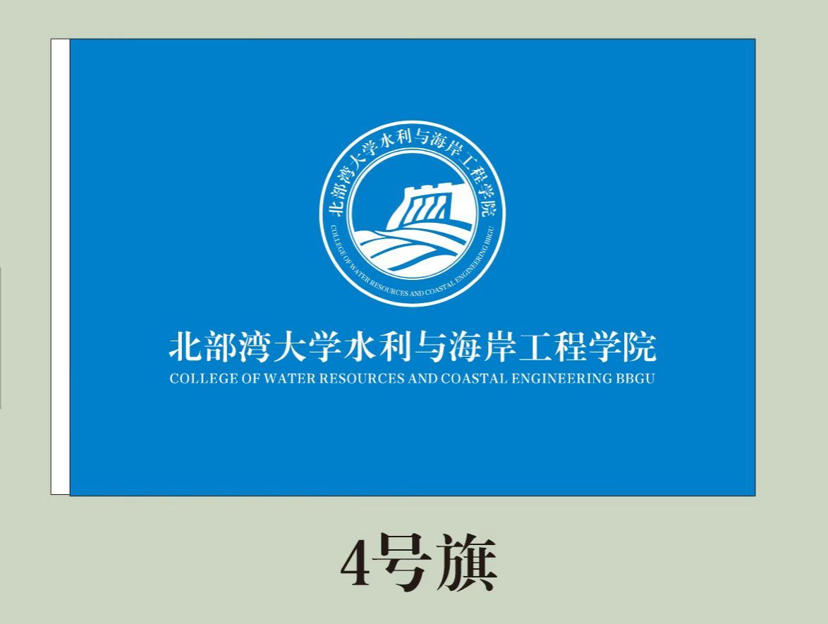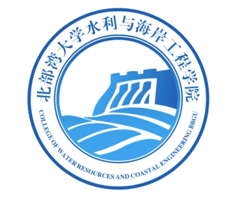 环绕文字。徽标上方环绕标准中文院名“北部湾大学水利与海岸工程学院”,下方环绕规范英文院名和校名英文缩写“College of Water Resources and Coastal Engineering, BBGU”,标识清晰,彰显国际视野。